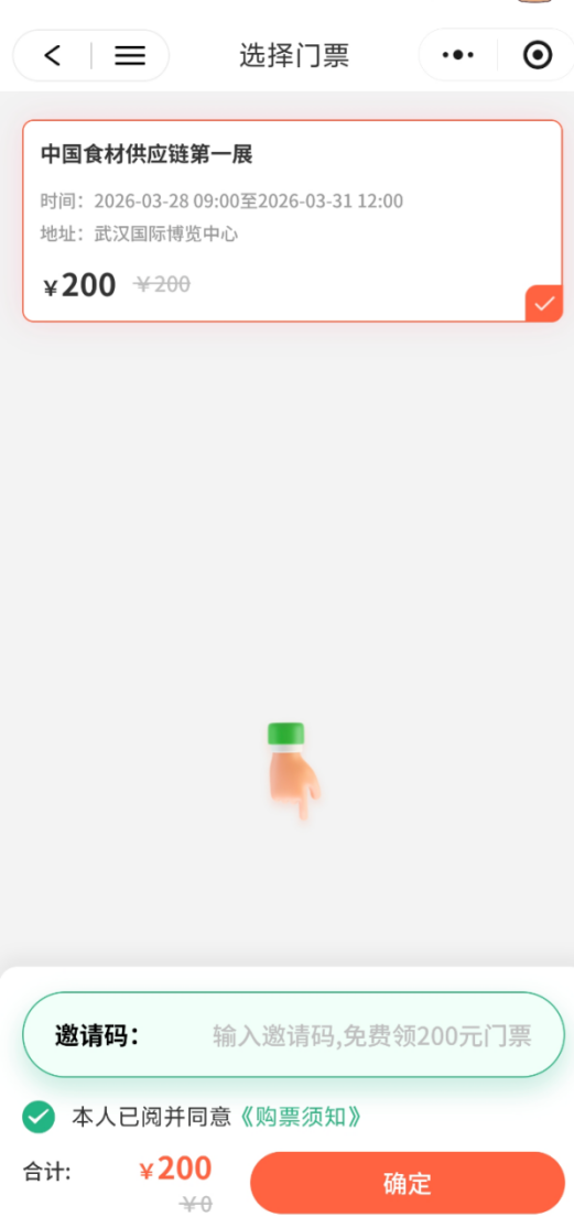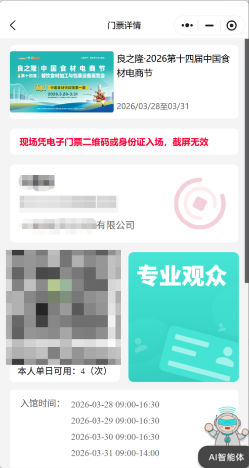 4、完成订票后,可以在易找食材小程序>>【我的】>>【我的门票】中查看已预定的门票,展期可扫码入场。