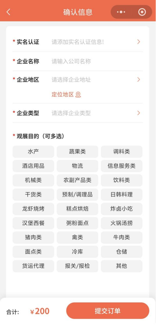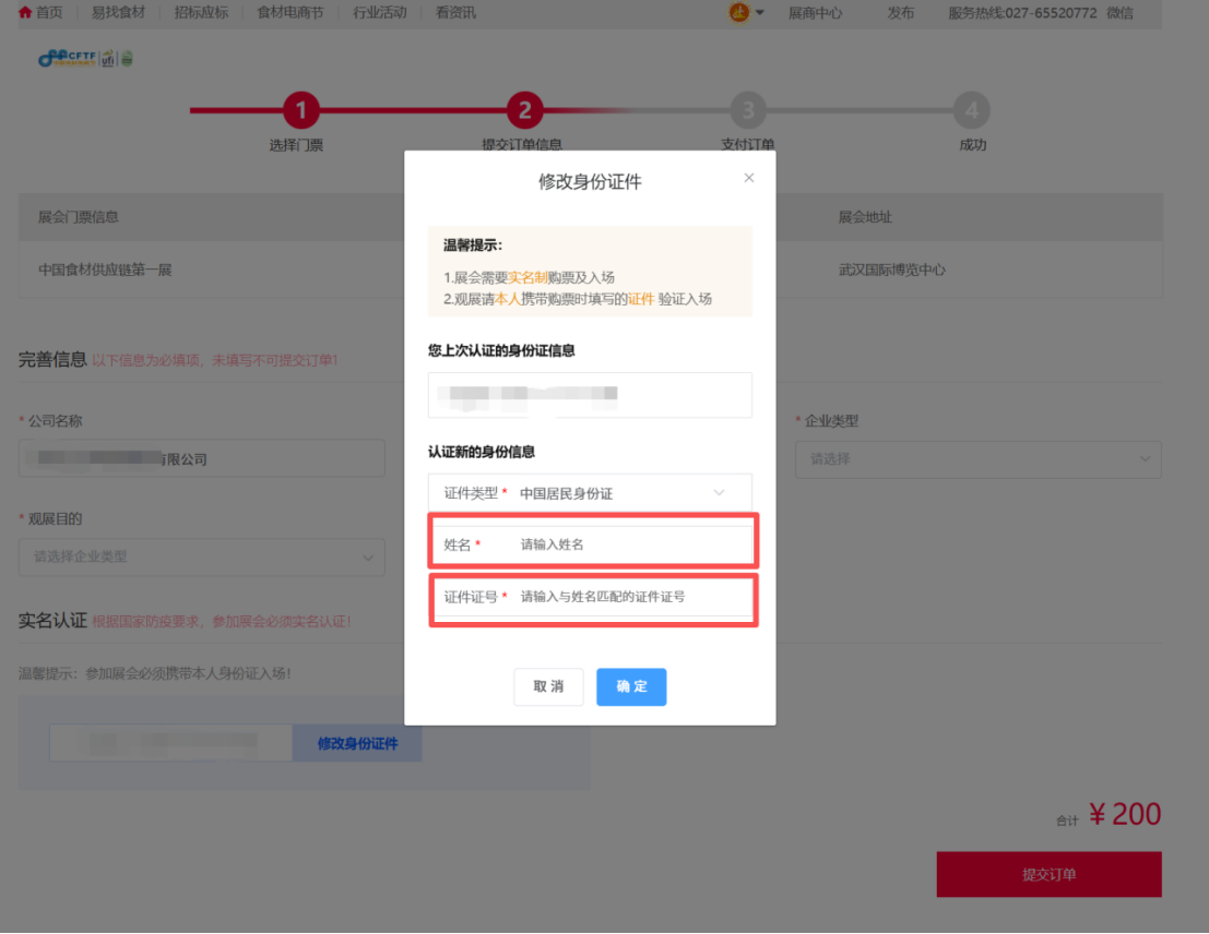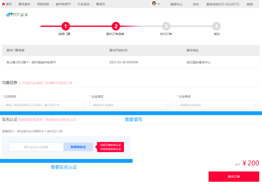 5、选择门票后,填写公司名称、企业地区、企业角色,实名认证填写身份证号后,提交订单。